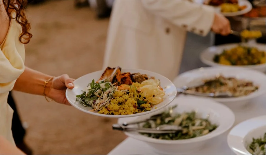 Yummy food either set at a buffet station or served to the middle of the tables for everyone to share.